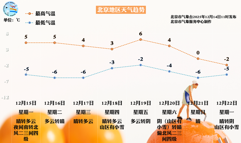 下周后期有弱冷空气活动,气温还有起伏,山区偶有雪花飘落,需关注临近预报信息。