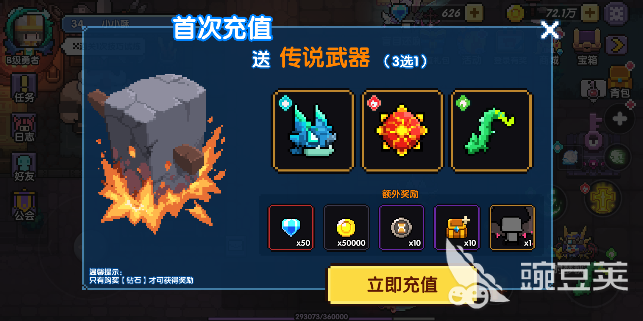 武器是玩家最重要的输出来源,按品阶分为稀有、史诗、传说、超越,超越基本上是毕业武器,传说是大部分玩家的中坚武器。而只要首次充值任意金额即可获得一把传说武器,能够帮助玩家快速发育。