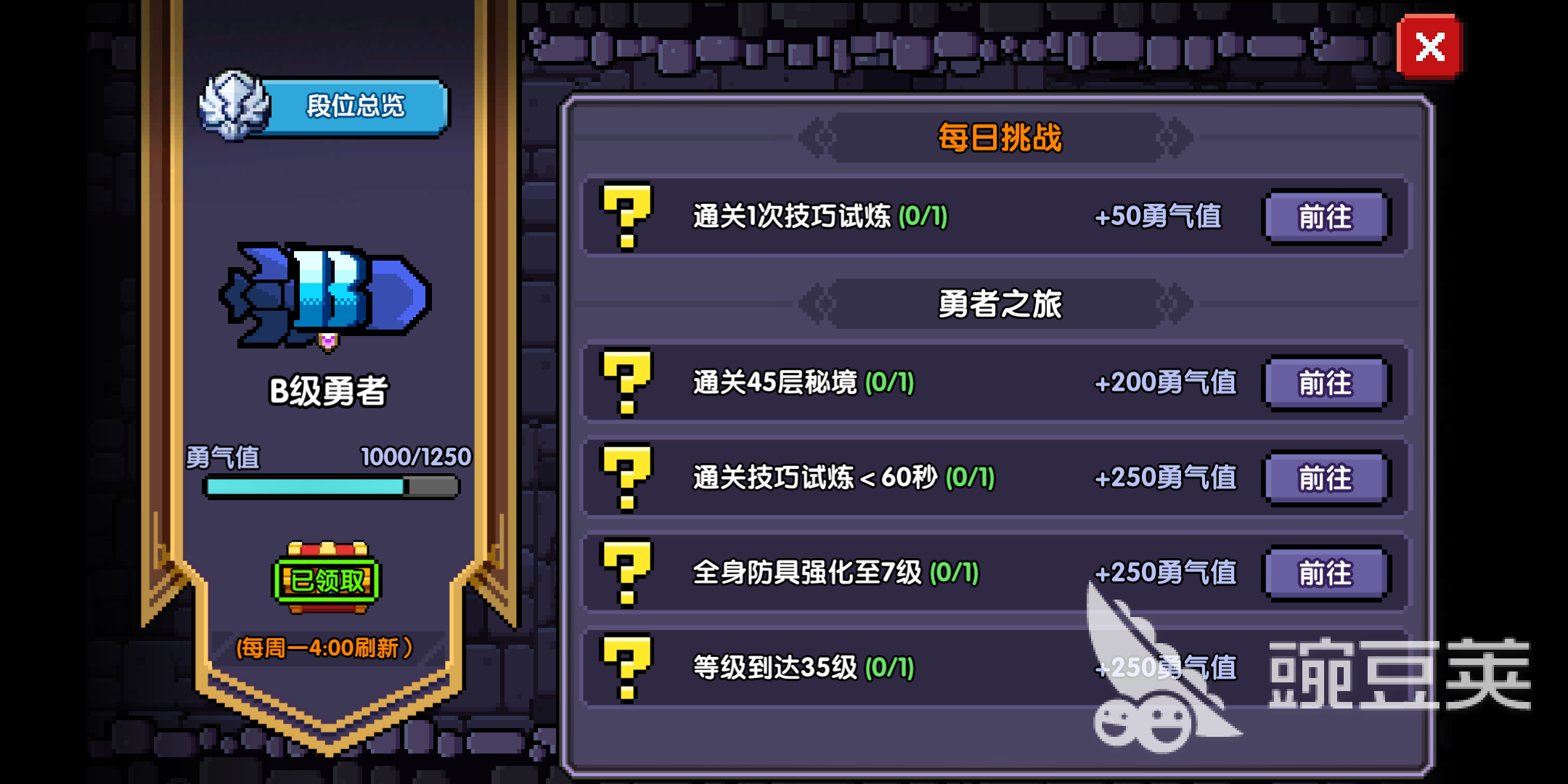 勇者段位从F~S不等,提升段位可开启更多的系统功能,也将获得更高层数的秘境挑战权。提升勇者段位需要消耗勇气值,勇气值可通过完成每日挑战或勇者之旅相关任务增加。