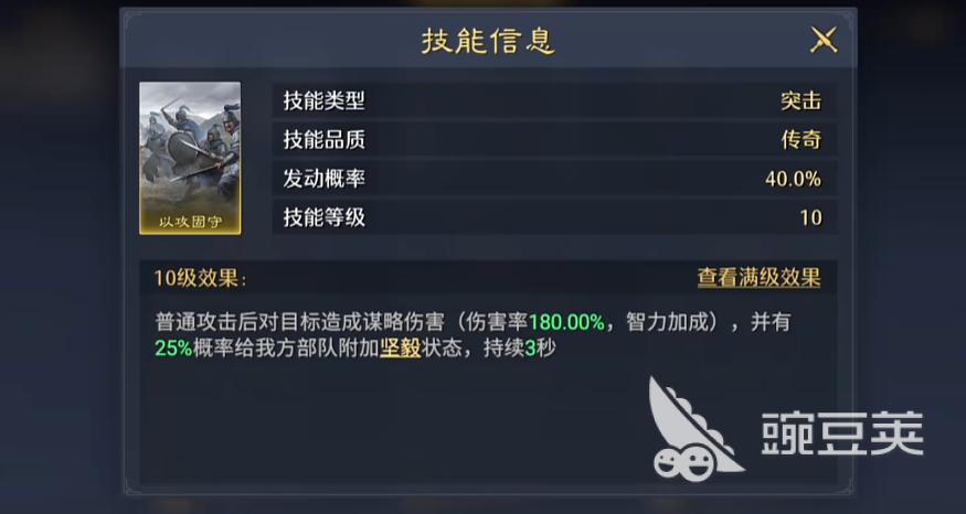 那么这里郭嘉他的这个以攻固守技能,也是非常适配于这个阵容效果的,在其中的话郭嘉打出普通攻击之后,还可以对目标带来一些谋略类型的伤害,这类伤害效果在伤害概率上面,虽然只有180%的加成,但是他能够带来的也有智力类型上面的属性提升效果,并且自身还有25%的概率,可以给我方部队施加一个减益的效果,减益效果一旦生效的话,在上面会直接持续3秒时间之内,为大家带来增益效果。