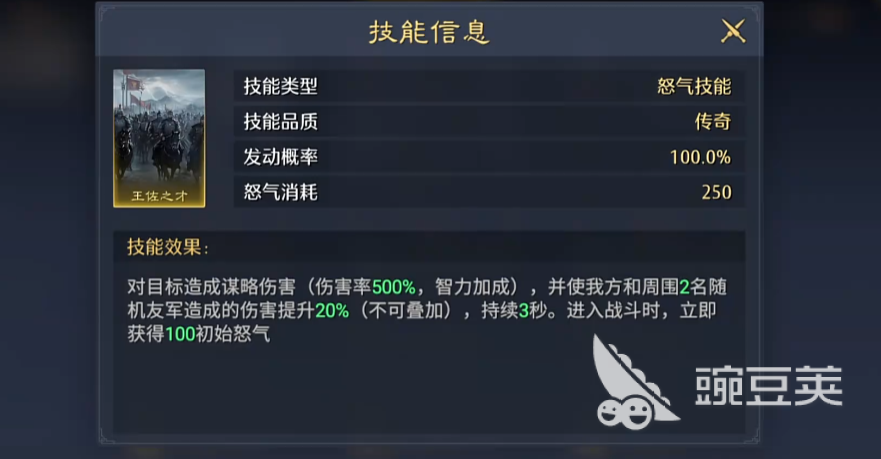 所以放在这里的话,郭嘉也可以跟荀彧的技能王佐之才放在一起搭配使用,而王佐之才这个技能相对来说的话对目标只要造成谋略类型伤害的话,带来的百分比就一定能高达500%,这样的输出数值放在主动技能里面也是非常好用的,而且目前的发动概率也达到了百分之百的一个概率,在成功输出之后,他还可以给我方以及周围两名的随机队友带来一个伤害提升的增益,虽然这个增益只能带来20%的基础提升,后期还不能叠加,但是这里带来的持续时间有3秒,所以利用这3秒大家就可以跟他的技能进行搭配,跟其他武将一起进入一个集火的战斗,此时进入战斗的话,武将自身也会有怒气数值的加成,因为这个技能卡给荀彧带来的就是初始情况下就有100点怒气积累的一个效果,所以这三名武将目前带这样的武将卡在前期,其实大家使用怒气大招的情况还是比较多的。