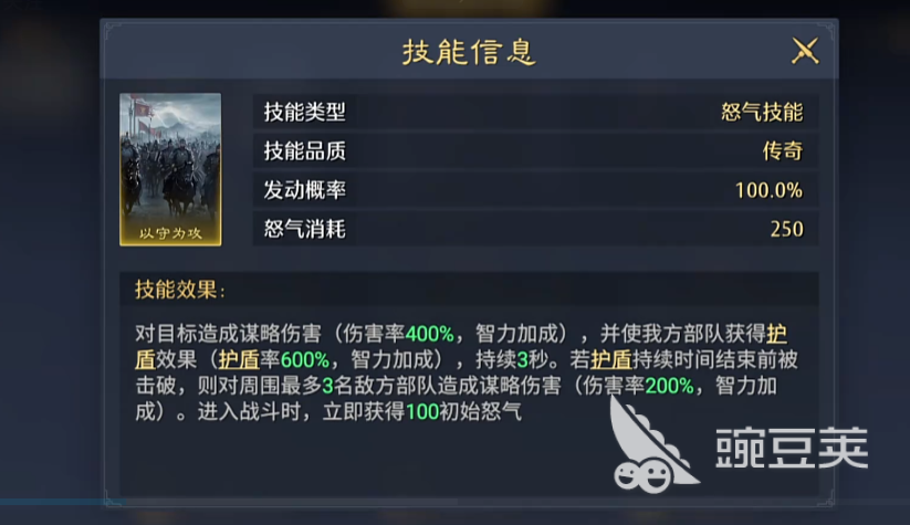 这里在整体的技能效果上面,首先曹操他在怒气技能效果上面,可以根据以守为攻这个技能牌带来足够的队伍加成,此时对目标造成的谋略类型伤害数值上面有400%的概率,而且可以带来智力上面的加成,还可以使我方的部队获取护盾的效果,这里护盾的概率也达到了600%的一个属性数值,在有足够智力加成的情况下,持续3秒的这样一个效果可以给我方带来非常强大的防御,所以并不是智力型的武将就不好用,那么在这里护盾持续的时间之内,只要在时间结束之前被对面给击破的话,那么此时我方的其他武将还可以对周围的敌人,最多3名敌人进行一个输出。