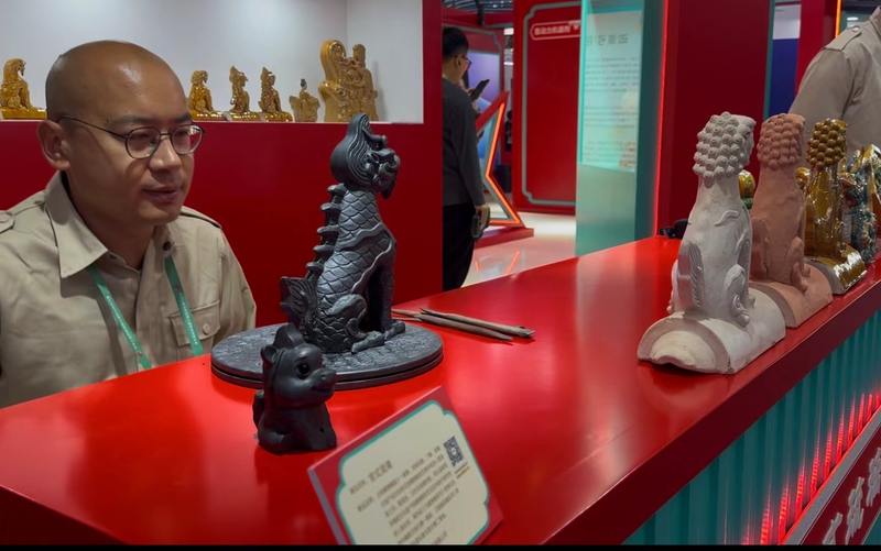除了来自科技领域的“重器”,北京市代表团成果展上还有技能匠人展示绝活。曹溪言是官式琉璃烧制技艺青年传承人,在他手中的是产自北京门头沟的黑色坩土泥,正在被雕刻成一个脊兽龙?!?#36825;只脊兽龙雕刻成形后,进行第一遍素烧,用煤来烧制7天至15天,温度达到1050℃,黑色的脊兽龙就会烧成白色,挂釉后进行第二次烧制,用柴烧一天,温度达到980℃,烧完后就会变成彩色?!?#26361;溪言介绍,“官式琉璃烧制技艺是一项国家级非遗,故宫、天坛等建筑上的琉璃瓦就是这种工艺烧制而成。”此外,太和殿微缩版十一脊兽、宝相花器、门、琉璃文创产品等都出自曹溪言之手。