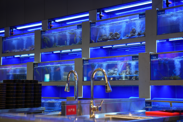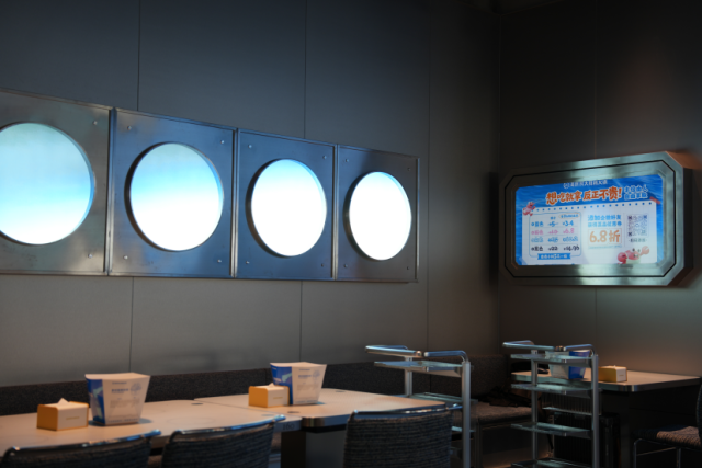 在这家店的等位区和店内,蓝色光影搭配金属材质的圆形“舷窗”,让人仿佛置身一艘准备启航的捕鱼船,包间以“船舱”编号……全店的空间线条与局部灯带延续海洋主题,让顾客在踏入门店的瞬间,就能感受到一丝来自海洋的沉浸式氛围。