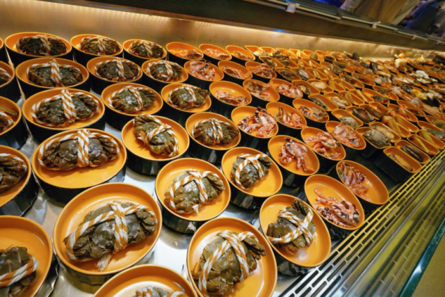 在产品设置方面,200 多款产品“多而不杂”,鲜切肉类、鲜活海鲜和铁板系列结合充满烟火气和市井感的现场加工,让“看得见的新鲜”成为顾客第一感受。同时,门店的产品会随着时令动态调整,让顾客“常吃常新”。