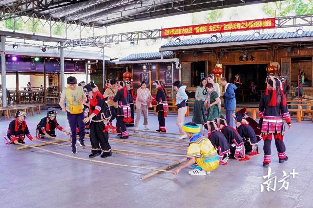 紧接着,震撼的铜鼓舞将气氛推向高潮。八面雕花铜鼓在壮汉的击打下发出浑厚回响,来自广州的吴先生兴奋地说:“这鼓点跳的是巴马人的精气神,让人不由自主就想舞动!”最热闹的还属竹竿舞环节。随着“开合、开合”的号子声,瑶族青年娴熟地操控竹竿,游客们跃跃欲试地穿梭其间。有人灵活跳跃赢得喝彩,有人不小心被竹竿“绊住”,引发阵阵欢笑。广州市增城区英华学校肖卓锐边擦汗边笑:“看着简单,跳起来才发现要手脚协调,比健身房有趣多了!”