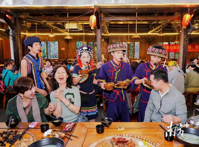 傍晚,大家齐聚仁寿源围坐在长桌宴旁,品尝巴马特色美食——香猪、火麻汤、五色糯米饭……“这才是真正的民族风情!”广之旅产品经理蔡毅感慨道。席间,瑶族同胞们为游客敬酒开舞,让亲情在此刻更加温暖。这场篝火晚宴不仅是一场味觉盛宴,更让每位参与者深深感受到巴马人民的热情好客和长寿之乡的独特魅力。火光渐熄,但这份温暖与欢乐,将永远留在每个人的记忆中。