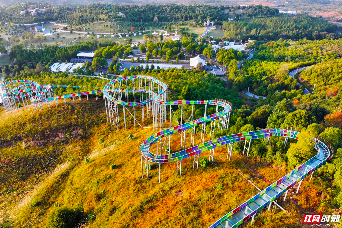 高空漂流、七彩滑道等网红项目嵌于山林之间。