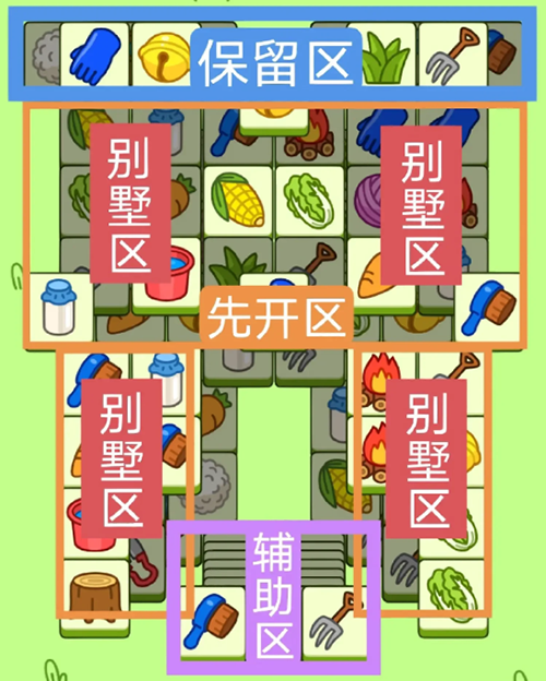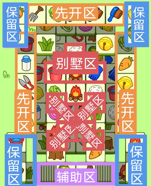 一个三角形大别墅,四个双叠牌小别墅,开局先消除橙色区,这里压牌比较多。然后按照一层层均匀消除表面牌。不要跨层太多拿牌,必要时可以用盲盒区辅助消除表面牌。尽量还是以别墅区内互相消除为王,蓝色区有叠牌,但是不多全部保留到后期使用。