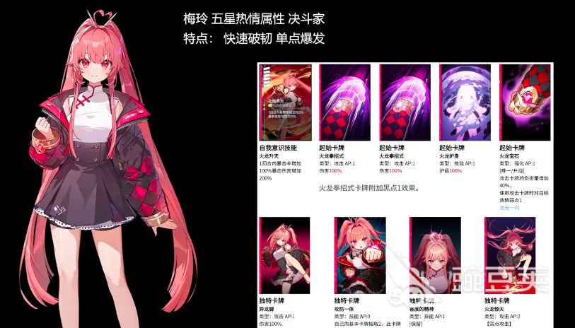 梅玲,很多玩家将其戏称为简单无脑暴力粉毛妹,其在配队要求方面是非常简单的,但整体可以打出非常强的伤害值,能够快速的破韧敌方打出高额的伤害量,角色的核心被动是“余烬”,怪物处于余烬状态怪物受到攻击或者击破时,按照持有余烬数量使伤害量增加30%。发动效果时移除一层于禁,最多可叠加5层,能够不停的给怪物挂debuff。卡牌方面是两个攻击、一个护盾,起始能力卡牌是攻击卡牌伤害增加40%。