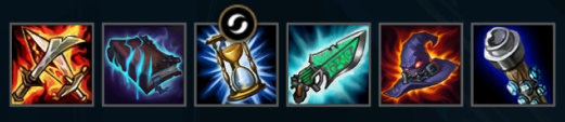 巫妖之祸+莫雷特的联盟秘典+中娅的沙漏+海克斯科技枪刃+灭世者的死亡之帽+虚空之杖