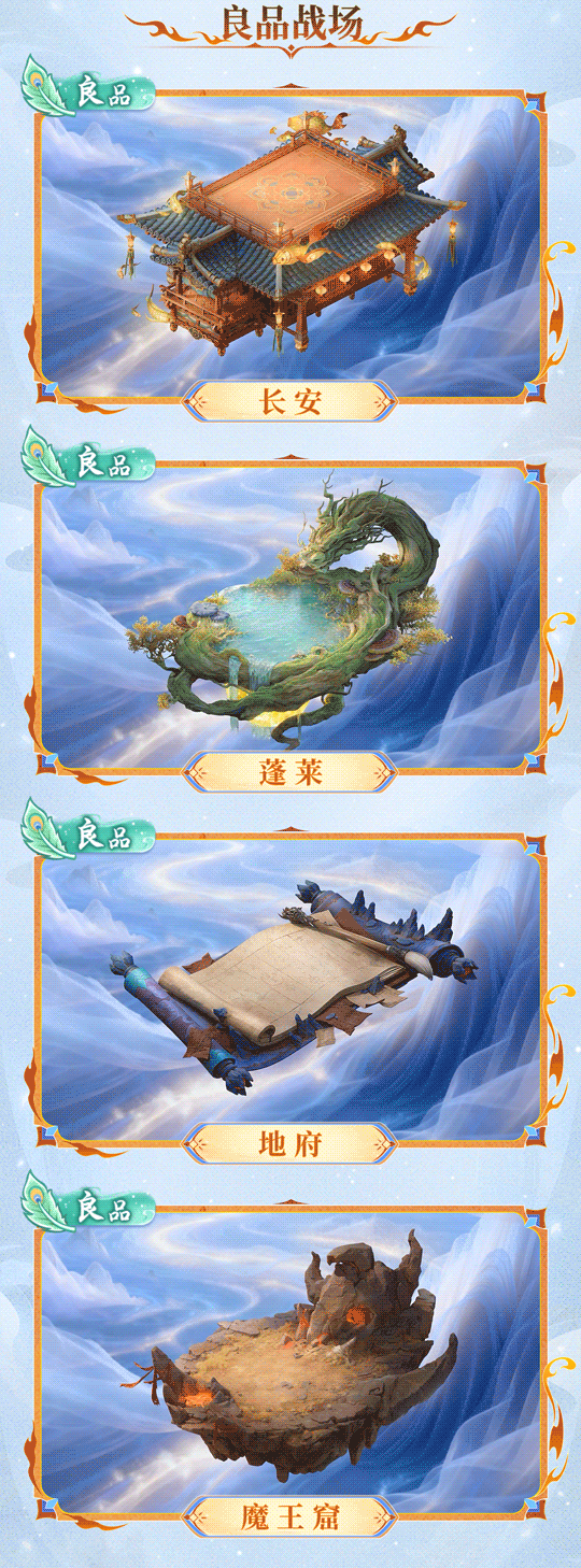 良品战场涵盖长安、蓬莱、地府、魔王窟四大经典场景,朱楼画栋的长安尽显大唐盛世繁华;“有龙则灵”的蓬莱透着缥缈仙气,肃穆神秘的地府与粗犷霸气的魔王窟也各具独特氛围感,每一处场景都能带来不一样的沉浸式对阵体验。?