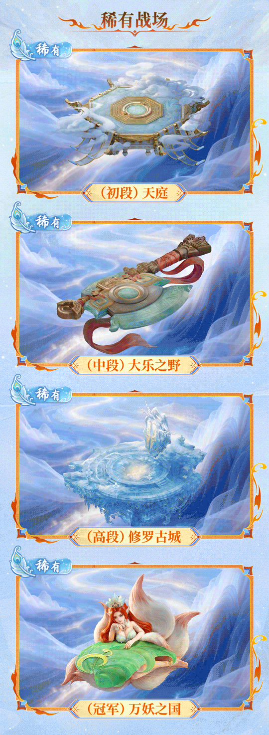 稀有战场则与段位紧密绑定,是实力的专属荣耀象征:初段解锁庄严气派的天庭,中段邂逅奇诡幻域的大乐之野,高段踏入战意凛冽的修罗古城,唯有冠军才能解锁万妖齐聚的恢弘万妖之国。段位越高,战场的视觉震撼力也越强,让实力与荣耀一同展现。?
