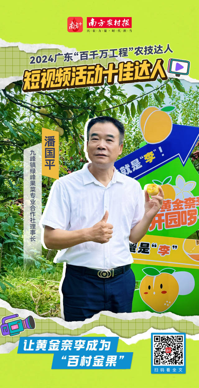 在乐昌市九峰镇的果园间,绿峰果菜专业合作社理事长潘国平用竹杆作架、草藤为绳,将手机变成“新农具”,把桃李梨种植技术送到坪石村等“百千万工程”典型村的田间地头。这位全国劳动模范以最朴素的方式,带动果农实从“种不好”到“种得好、卖得好”,书写了“小视频”撬动“大增收”的助农佳话。