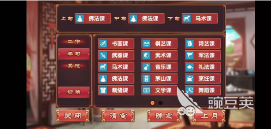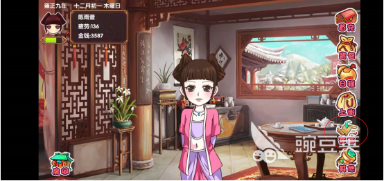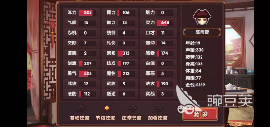 3、初始安排客栈或是家务,提升女儿的体力属性。等课程开启后,首先安排舞蹈课,用于提升魅力和气质,金钱不足时安排前往戏班工作。当舞蹈课大于30时,魅力值基本达标。