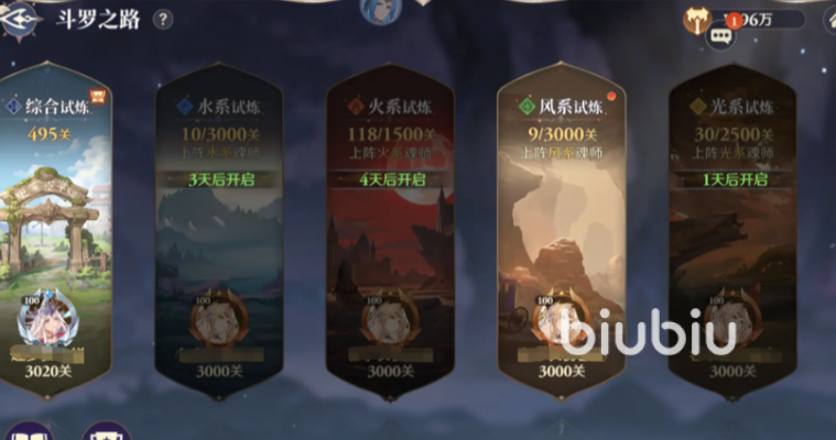 这下一步就是去了解这斗罗之路玩法中的各种试炼,这了解试炼是很有必要的,因为这玩法中的试炼有很多个,且要求都不同。而说到这要求,当大家进入到这斗罗之路玩法之后,会看到这玩法中一共有五个不同的试炼,这五个不同的试炼分别是综合试炼、水系试炼、火系试炼、风系试炼和光系试炼。 这五个试炼中,除了第一个综合试炼外,其他的试炼都对魂师有一定的要求,这要求就和试炼的元素有关,大家只能带对应元素的魂师去进行挑战,就比如我们用的是风系魂师,那就只能挑战风系试炼;而如果是光系试炼的话,那就只能由光系魂师来挑战,这就是该模式中试炼的详细情况了。在初步了解试炼关卡的机制后,接下来就可以开始挑战这试炼关卡了。