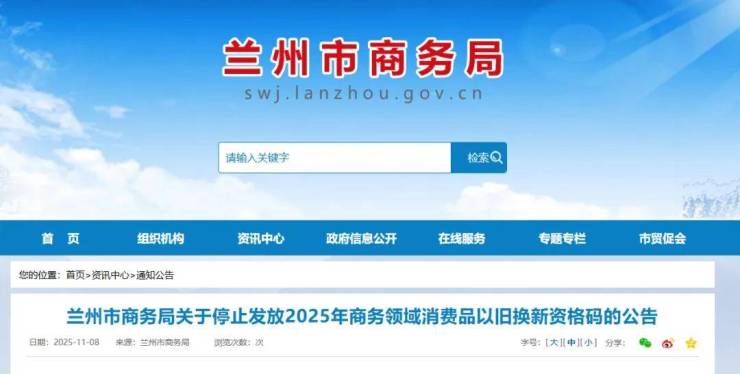 兰州市则因年度资金用尽,自11月10日起兰州市范围内(不含兰州新区)停止了涵盖汽车、家电、3C数码、电动自行车和家装厨卫“换新”等补贴政策。