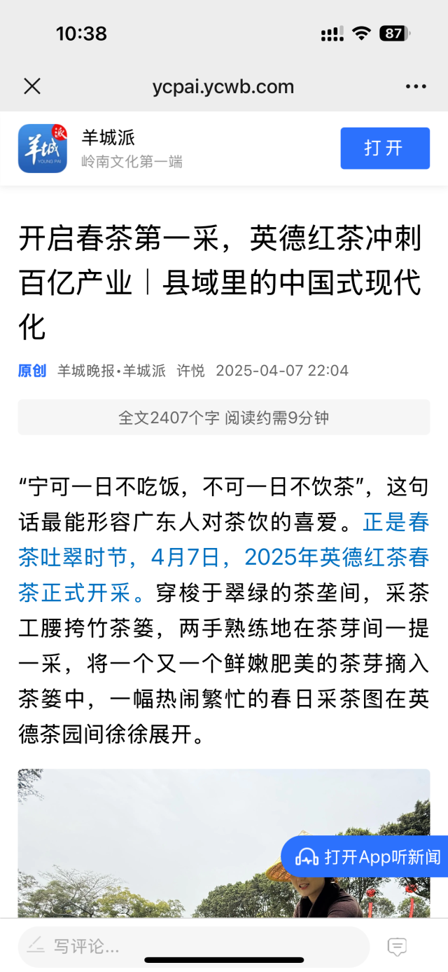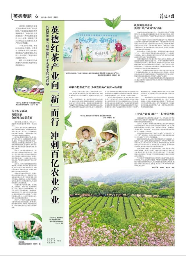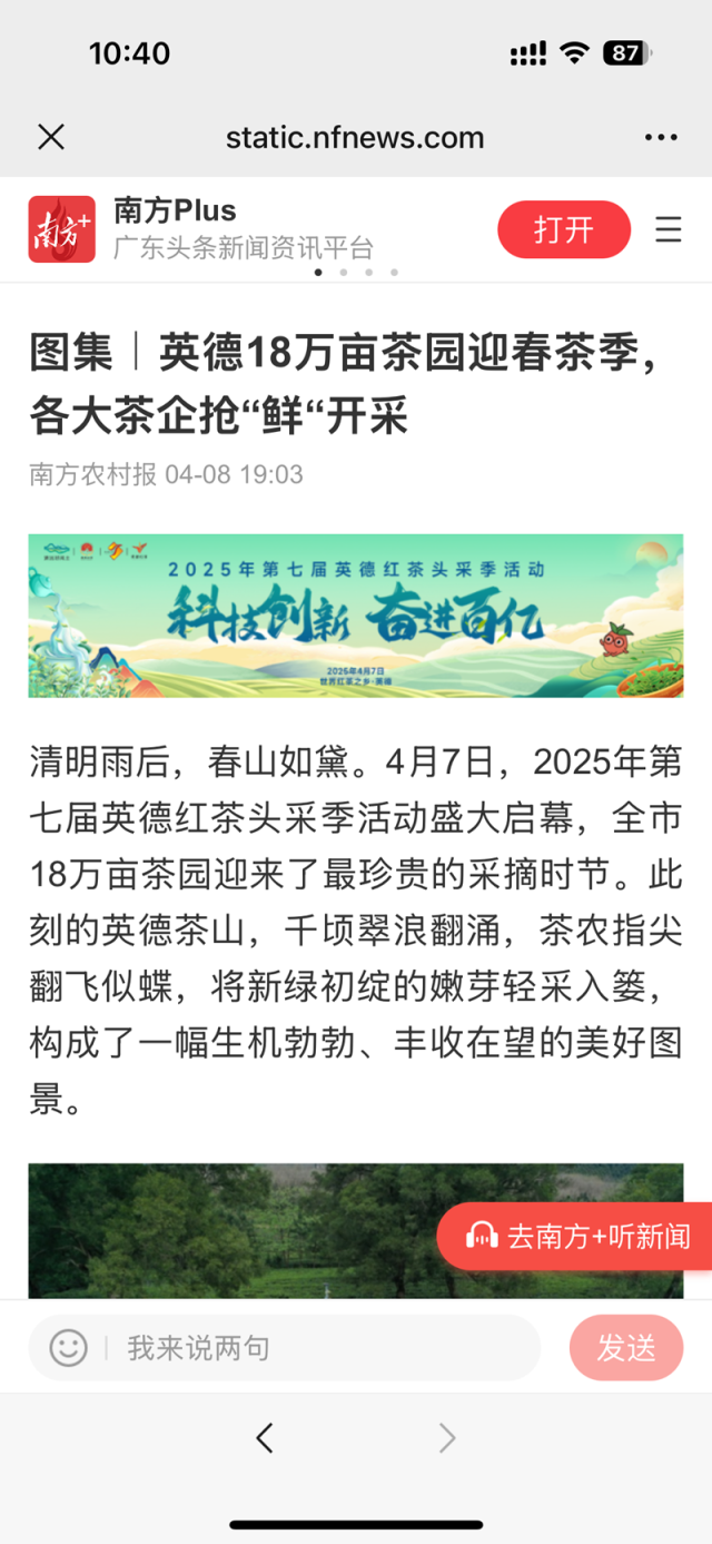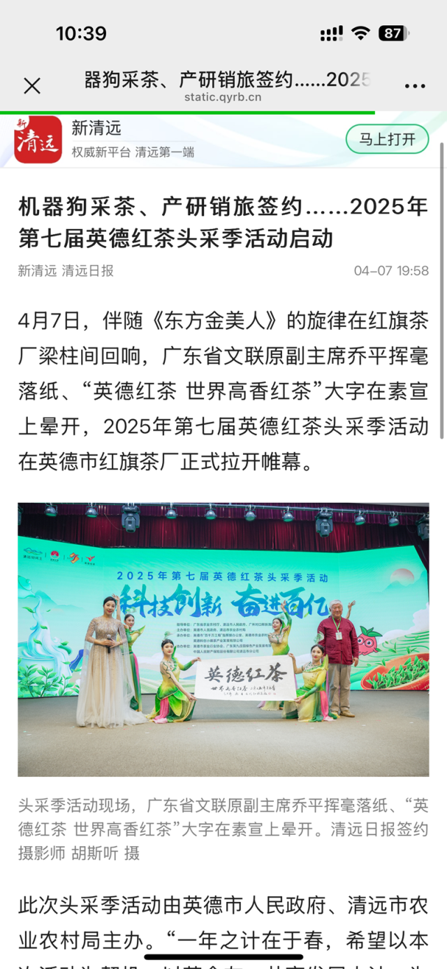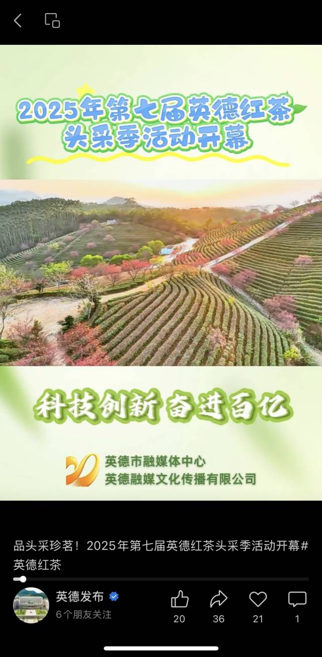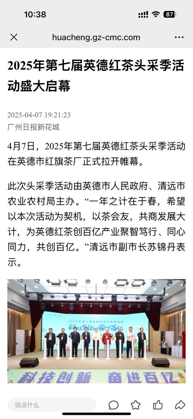 4月7日,2025年第七届英德红茶头采季活动在清远英德隆重启幕。这场茶界盛事吸引了社会各界的广泛关注,新华社、央广网、中国新闻网、南方日报、羊城晚报、广州日报、南方新闻网、广东广播电视台、南方杂志、南方都市报、南方+、南方农村报、清远日报、英德电视台等国家、省、市、县区级主流媒体高度关注,活动宣传视频、报道还在学习强国、今日头条、网易、搜狐、微信视频号等新媒体平台广泛传播,从航拍茶园全景到特写采茶细节,从产业全景到文化故事,全方位讲述英德红茶的独特魅力,提升了英德红茶的知名度和影响力。