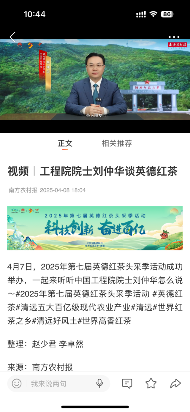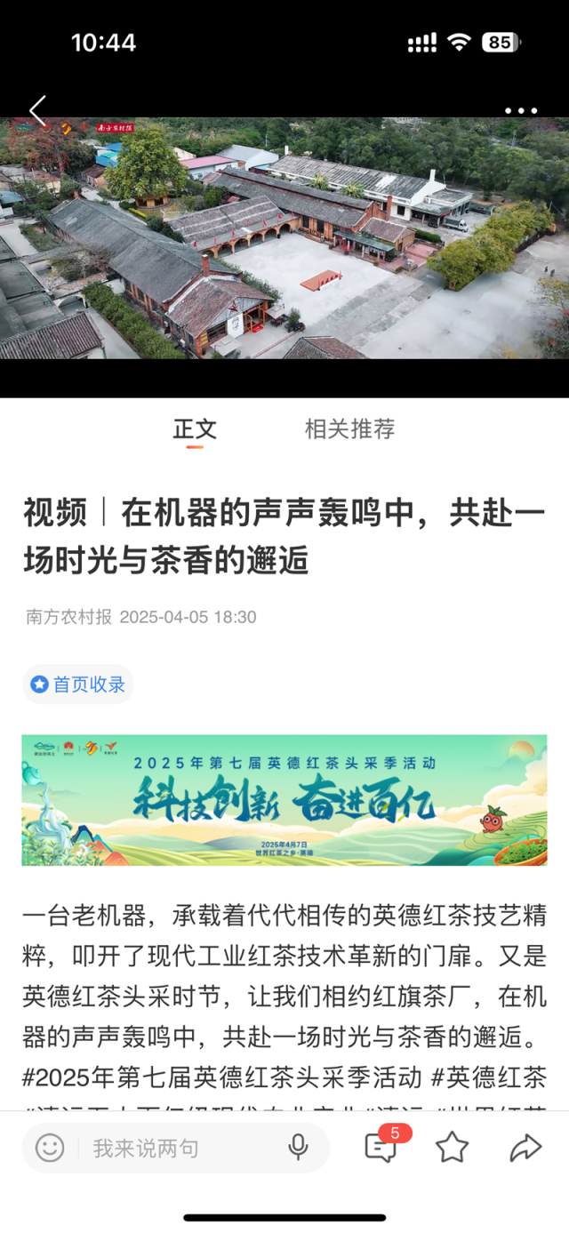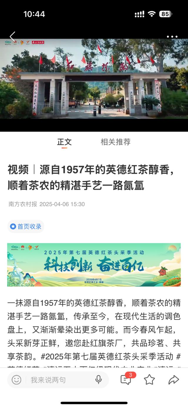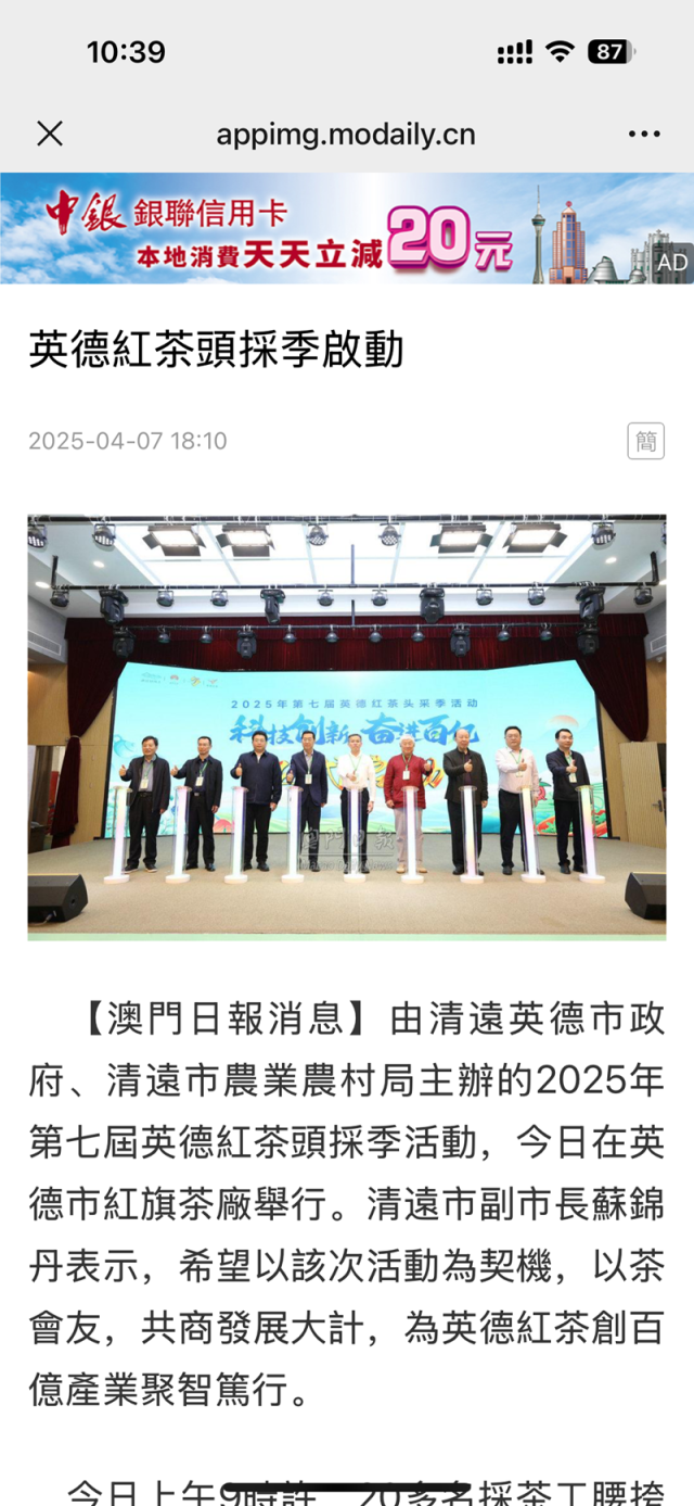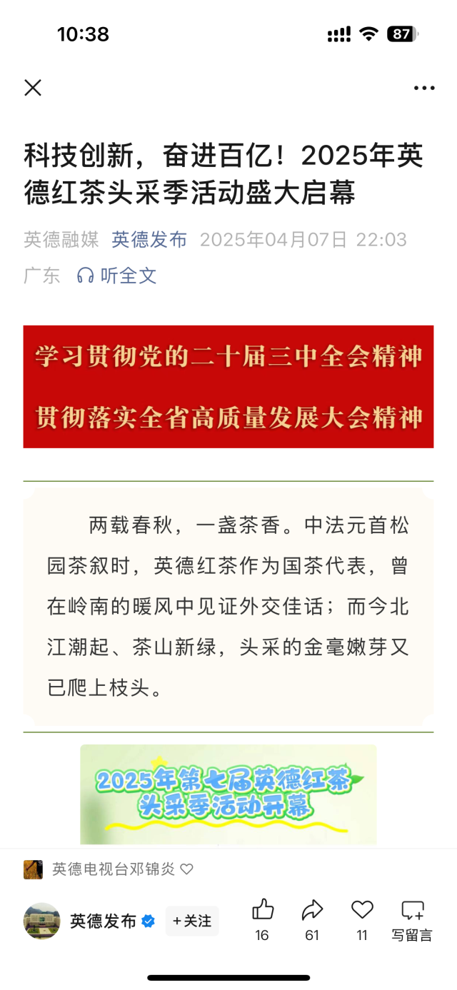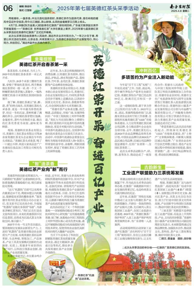 4月7日,2025年第七届英德红茶头采季活动在清远英德隆重启幕。这场茶界盛事吸引了社会各界的广泛关注,新华社、央广网、中国新闻网、南方日报、羊城晚报、广州日报、南方新闻网、广东广播电视台、南方杂志、南方都市报、南方+、南方农村报、清远日报、英德电视台等国家、省、市、县区级主流媒体高度关注,活动宣传视频、报道还在学习强国、今日头条、网易、搜狐、微信视频号等新媒体平台广泛传播,从航拍茶园全景到特写采茶细节,从产业全景到文化故事,全方位讲述英德红茶的独特魅力,提升了英德红茶的知名度和影响力。
