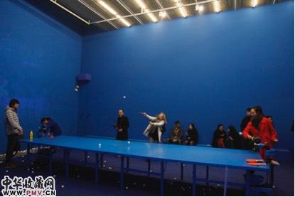 尽管舍不得美味,但更好奇不远处的喧闹和音乐是由何而来,再快步走向空间右侧展厅。更加宽广的蓝色空间中,加长的乒乓球台横贯其中,两侧的自动发球机匀速弹出白色小球在空中划出一段段曲线。观众拿着球拍,暂时放下传统的对战模式,围在球台旁开始一场混战。
