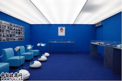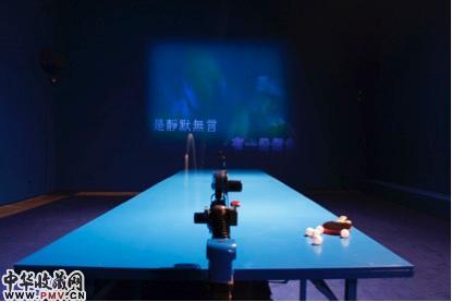 展厅尽头的蓝色墙壁上不间断播放卡拉ok,手持话筒引吭高歌的麦霸们跟乒乓混战不仅互不干扰,反而相得益彰。再仔细观看一下,发现展厅一角有一扇半开的门,走近后发现门内漆黑一片。如果你试探着走入这所黑房子,喧杂将被抛在门外,静谧的黑色中传来阵阵如圣歌般悠远的歌声。询问工作人员后,才知道这首歌叫做《政纯颂》。