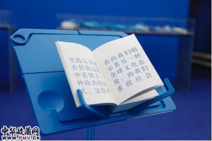 顺着蓝色楼梯走上二楼,展厅尽头挂着一幅“政先生”肖像,左侧排放五个蓝沙发、五个足底按摩器、五个放着“政纯书”的蓝色支架,另有三个展台陈列着艺术家的日常物、创造物以及十周年纪念品,沙发后面的墙上整齐粘贴着艺术家十年间的留影。
