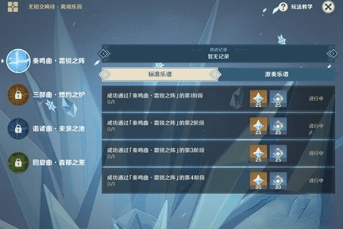 1、天过一共设有4个关卡,原神每两天开启一个新的无相关卡。每个关卡有标准乐谱和激奏乐谱两种模式。交响