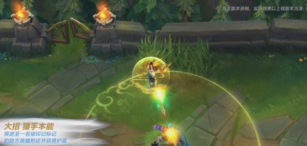 突进至一名被印记标记的敌方英雄附近并获得金色微光/墨绿金黄色渐变的护盾,移动将留下金黄色和星光拖尾特效。