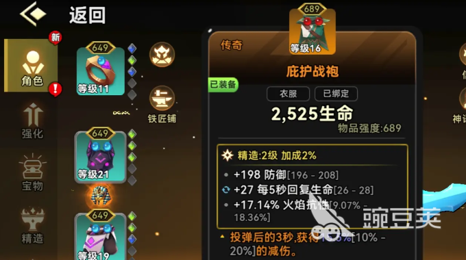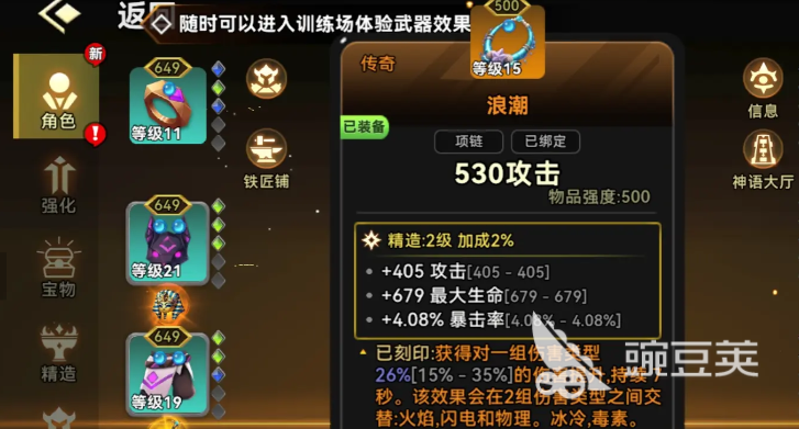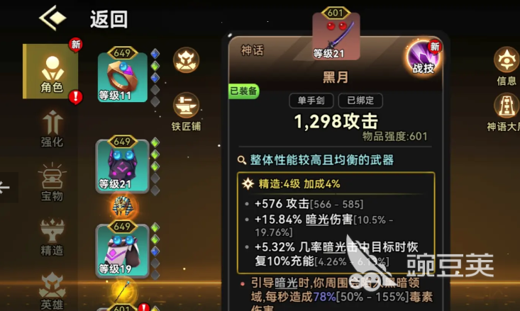 在衣服上面可以选择庇护战袍,获得198防御,还有2525生命。还有每5秒27点生命回复,在投弹之后三秒还能获得15.5%的减伤,生存能力是比较出色的。项链可以用浪潮,有405点固定攻击,还有679最大生命,并且还有4.08%的暴击率。更关键的是刻印效果在交替之后就能提升两种伤害类型26%的伤害,输出提升还是超级明显的。武器方面可以选择黑月单手剑,基础攻资是1298但可以获得15.84%的暗光伤害。