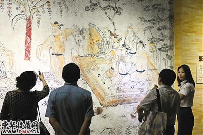 游客欣赏陕西历史博物馆新入藏壁画 首席记者 张宇明 摄 作者:张佳采 来源:西安晚报流失海外的唐武惠妃墓壁画,整体搬迁回来的唐韩休墓壁画,唐章怀太子墓壁画,这些名震海内外但从未公开展出过的珍品壁画,究