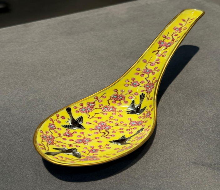 清同治黄地粉彩梅鹊纹羹匙,寓意“喜上眉梢”,题意鲜明,黄地显尊、粉彩精润、金彩点缀,反映晚清御窑在礼制筵器上“密而不繁、雅而不薄”的工艺追求,是同治朝大婚用瓷制度化生产的体现。藏品旧藏于丹麦电报公司经理、艺术收藏家索弗斯·布莱克(1882-1960年)家族,经历百年辗转,在海外华人藏家多年寻访与洽商后,于欧洲拍场竞得,回归后首次面向公众展出。参展位置在团河行宫璇源堂。