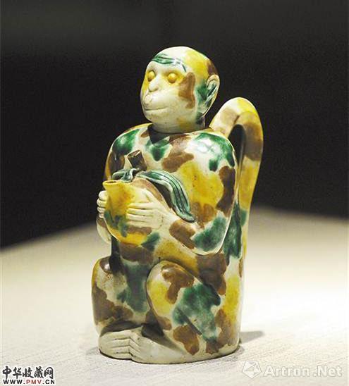 三峡博物馆“大圣归来:文物上的十二生肖”新春特展上展出的素三彩美猴献桃执壶 [昭陵博物馆:首次“露面”的人身石生肖猴]