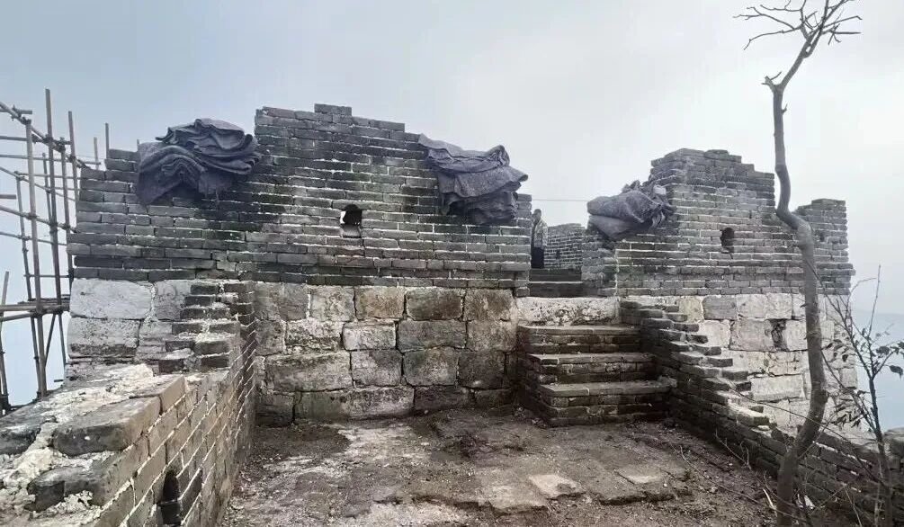 今年5月,“北京结”修缮工程正式开工,在300米落差的山脊上演了一场“石条复位战”。区文物管理所长城修缮技术顾问程永茂坦言:“这次修缮,是箭扣修缮10年里最险、最难的。”施工团队需先将受损的旧石条从上至下小心拆卸并妥善保存,再依据原有接缝痕迹复原。为保证“修旧如旧”,施工团队始终秉持“能复用旧料绝不添新料”的原则,北墙拆卸的旧石条尽可能原位安装,仅在缺失部位补充新料,且新石条均从房山区取样定制,经专家认定后采用人工劈凿自然断面工艺,再通过做旧处理实现新旧融合。