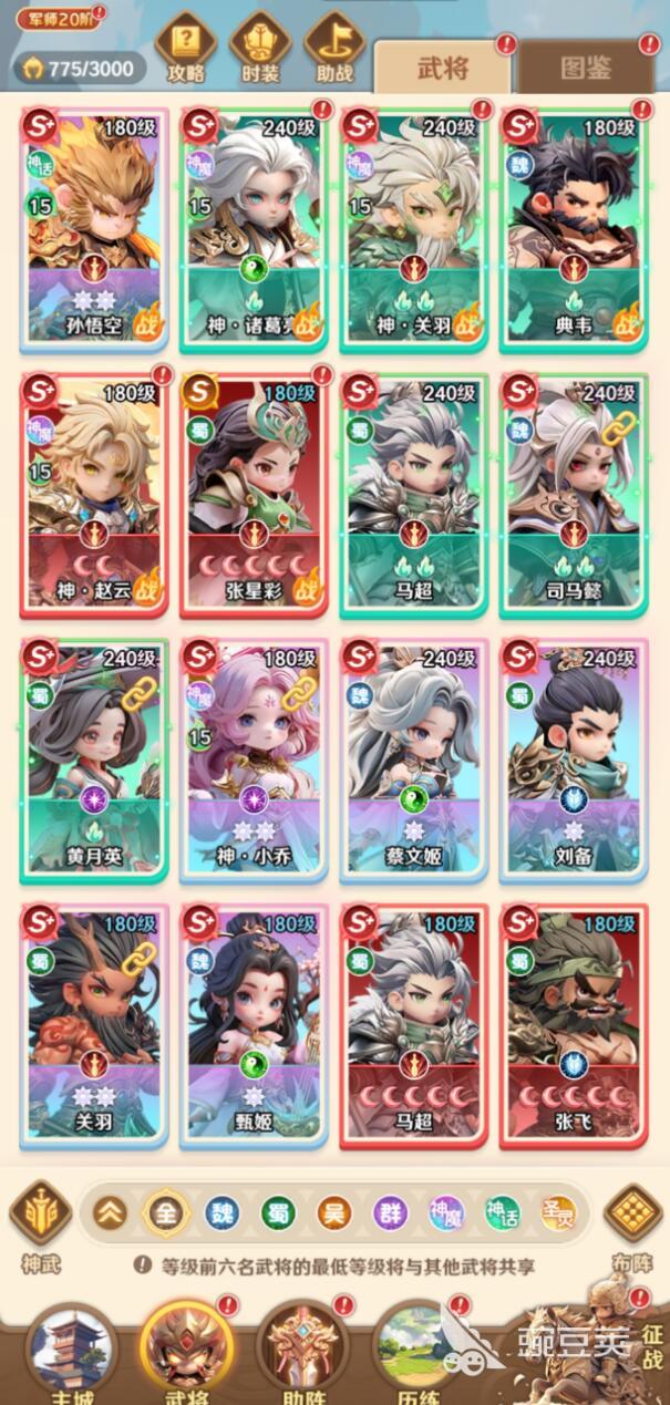 玩家要注意,将核心的武将优先升级到6星,这样才能够有效地解锁关键性的技能,比如关羽、吕布等等。S+核心的武将其实玩家需要将其保留,避免因为材料不足的情况下直接出现卡级的问题。新手在搭配阵容的时候,可以直接选择过渡的阵容,比如说关羽,张飞、诸葛亮,貂蝉,小乔等等,直接作为混搭流。由于这些角色获取比较容易,在搭配合理的情况下,实力也是不容小觑的。
