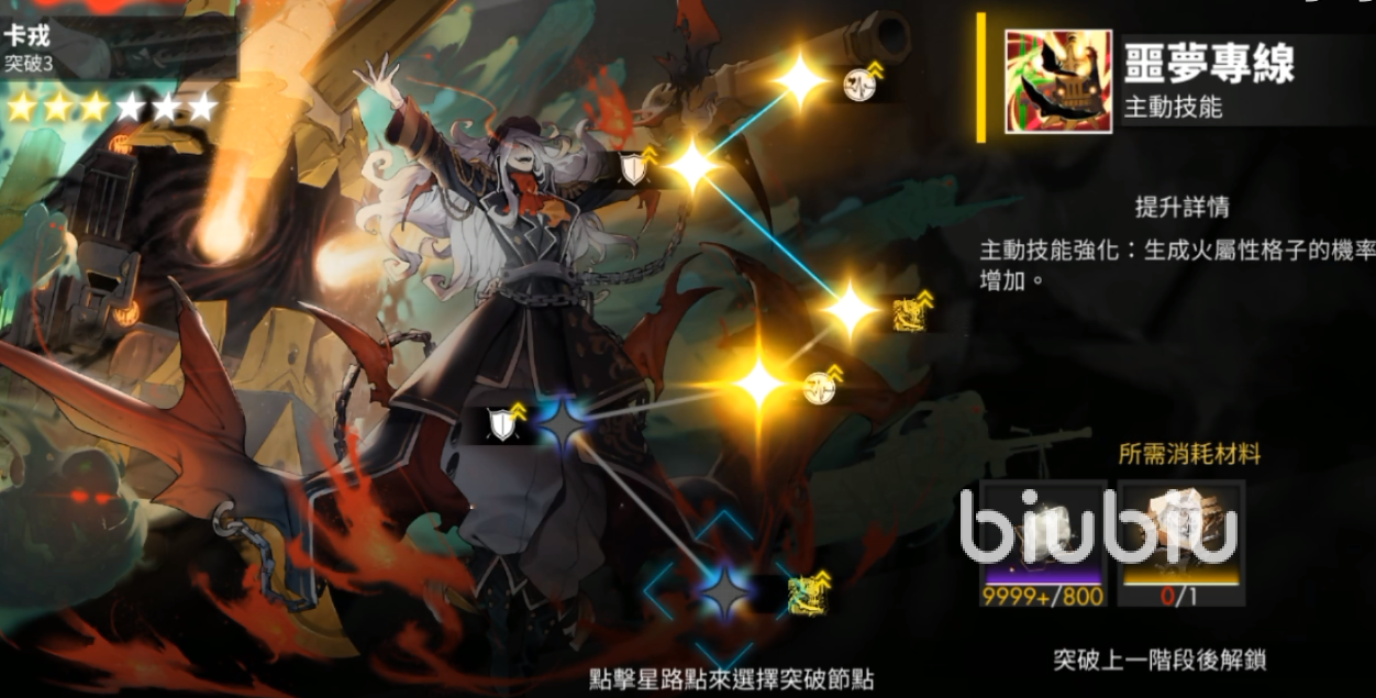 装备技能:装备最多升级9级,获得火属性克制的伤害加成,装备觉醒三的时候攻击可以向斜方释放,加攻击力,而且无视敌方防御值。装备的等级大大影响卡伦的技能输出,如果想要玩好这一个角色,在装备方面不能马虎。