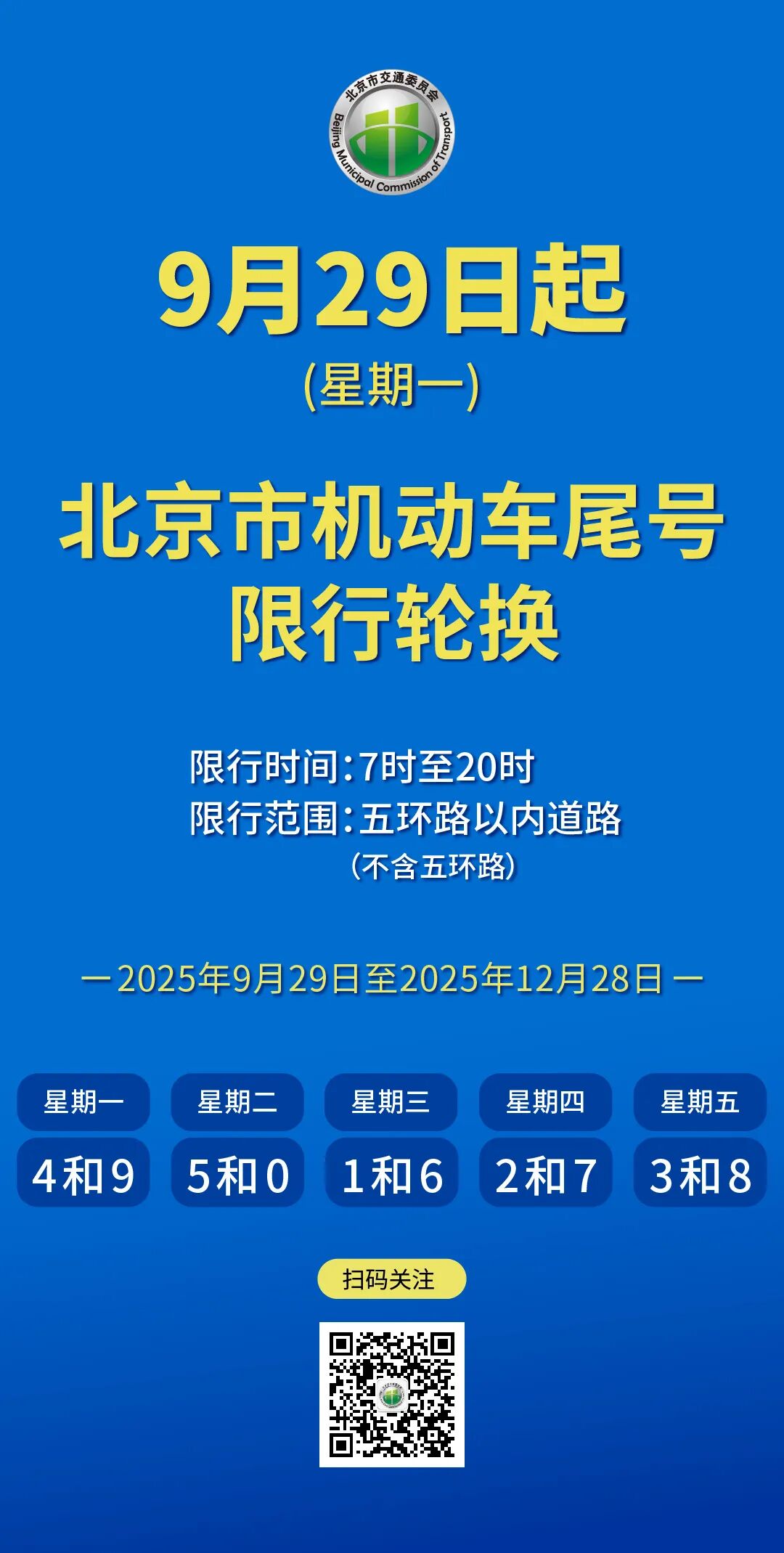 新京报讯 据北京交通官微消息,2025年9月29日至2025年12月28日,星期一至星期五限行机动车车牌尾号分别为:4和9、5和0、1和6、2和7、3和8机动车车牌尾号为英文字母的按0号管理)。编辑