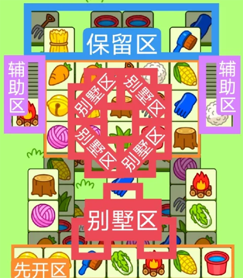 3.必要时可以用紫色盲盒区辅助消除,盲盒区后期不用留太多,留几张备用即可。