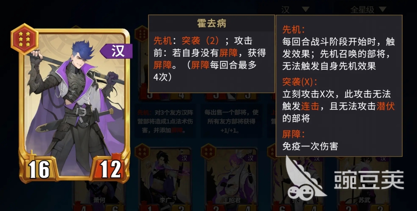 此阵容的核心为霍去病、李广与卫夫子三人,在霍去病和李广能为自己上屏障的情况下,卫夫子可为失去屏障的角色加攻的特性能与两人形成绝佳的搭配,若担心屏障碎不掉,还可上吕后来协助碎掉屏障,让霍去病必拿到加攻效果,大部分情况下的搭配为2霍去病、2卫夫子、李广、吕后、东方朔。