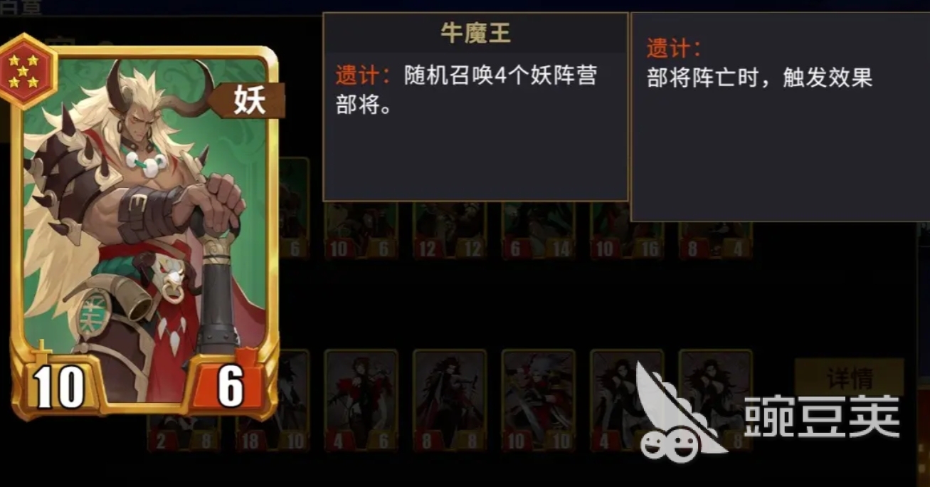 核心部将为石矶、牛魔王和铁扇公主,其它可随意搭。实战中玩家可通过让牛魔王召唤出妖族部将,辅以铁扇公主在有妖族阵亡能为全体妖族阵营角色加攻的特性,以及石矶为牛魔王提供的不屈效果,可令场上一直存在被召唤出来的妖族部将,快速完成攻击的叠加增强队伍的作战能力。