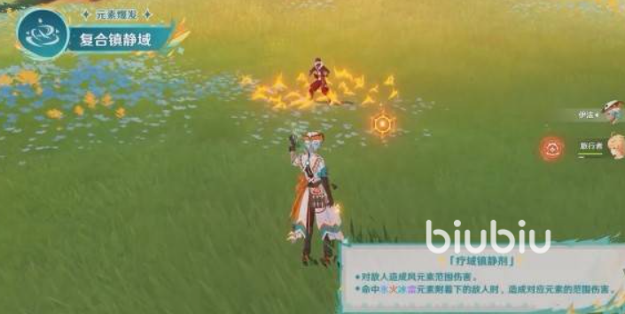 他的元素爆发,会发射出镇静剂,并用风场牵引束缚住里面的敌人,镇静剂会对被束缚的目标造成风元素范围输出,命中水、火、冰、雷元素附着下的目标时,还会造成一次对应元素的范围输出。