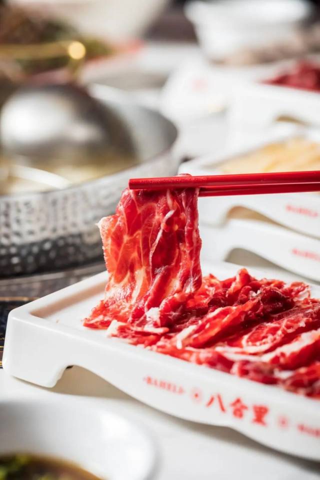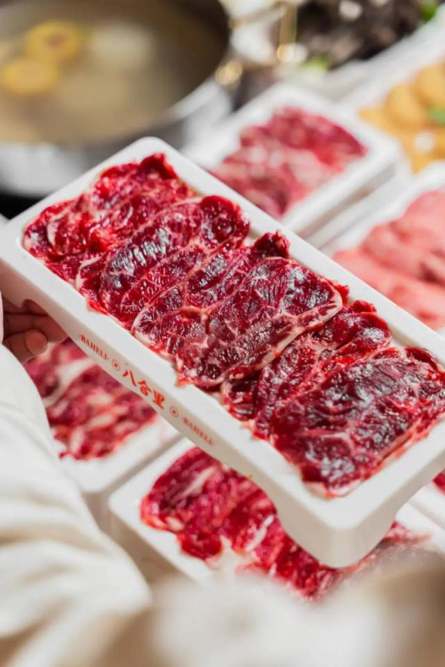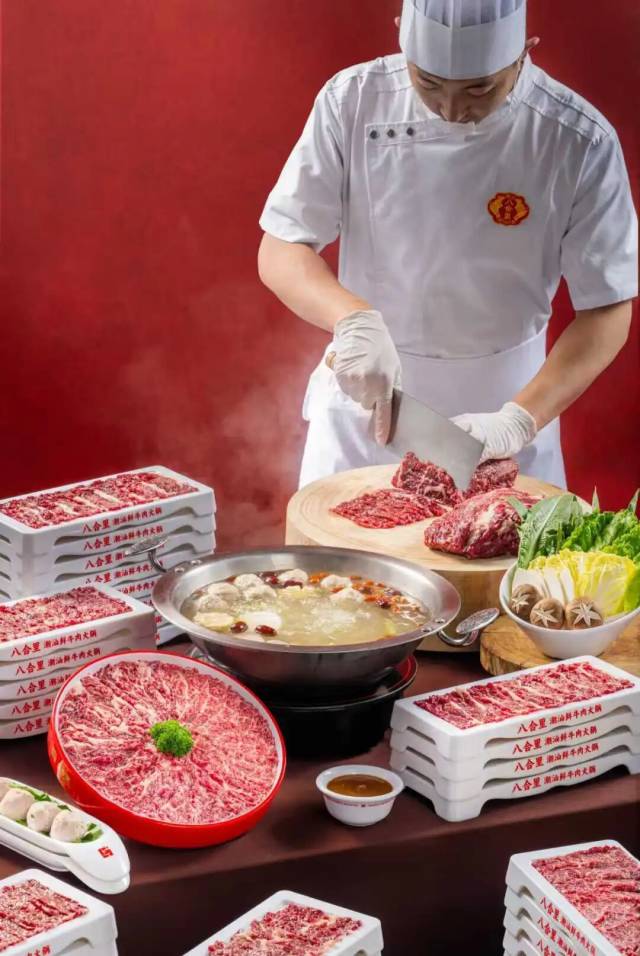 在明档厨房的砧板前,厨师们正手持薄刃刀演示切肉技艺,刀起刀落间,肥瘦相间的吊龙被切得厚薄均匀,码盘后倒置竟纹丝不动。如今,这幕日常场景,正是八合里用标准化重构潮汕牛肉火锅行业的生动缩影。