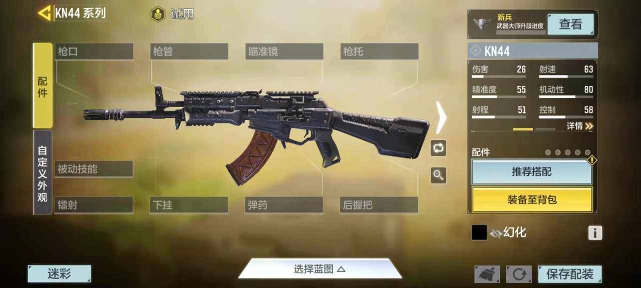 枪托选择MFT突击枪托,可以降低开镜子弹散布,降低受攻击时候枪口上抬的影响,降低受到的水平后坐力。弹药方面,因为KN44不准备去近战,所以三十发的弹匣也算是够用了,不使用扫射的情况下,能够持续战斗。后握把选择斑点磨皮握把,可以降低开镜的时间,还有跑动射击时候的延迟。这些配件是当前大神玩家中比较主流的配件,但是也有一些玩家喜欢将KN44当做是移动射击来使用,所以搭配了一些机动性的配件,具体就是将枪托换成了无枪托,能够降低开镜时间,增加开镜移动速度。