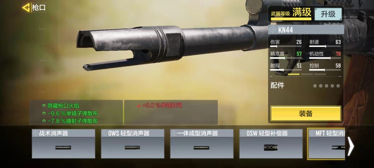 枪口选择MFT轻型枪口制退器,可以大幅度降低水平后坐力,还有开镜时候子弹的散布。枪管选择MFT轻型枪管,可以降低开镜的时间。如果有的玩家喜欢远距离战斗的话,可以将这个配件换成OWC游侠长枪管,可以增加百分之二十的射程,还有降低了水平后坐力,也是可以的。瞄准镜就不选择了,而且kn44的机械瞄准镜在所有的突击步枪中是感觉非常好的一个,中距离依然能做到精准。