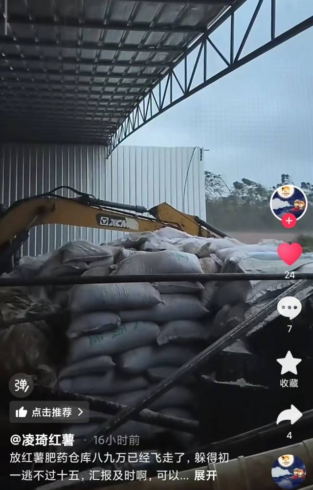 除了甘薯地里的灾害损失,记者还通过廉江一甘薯种养合作社发布的短视频注意到,该合作社用来专门放置甘薯专用农药和化肥的仓库被台风吹至破损,漏雨严重,现存农资遭受雨淋,损失近十万元。