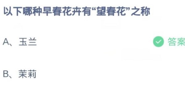 解析:玉兰一般会在三月中下旬时盛开,是答案初春时节开花最早的花卉之一。