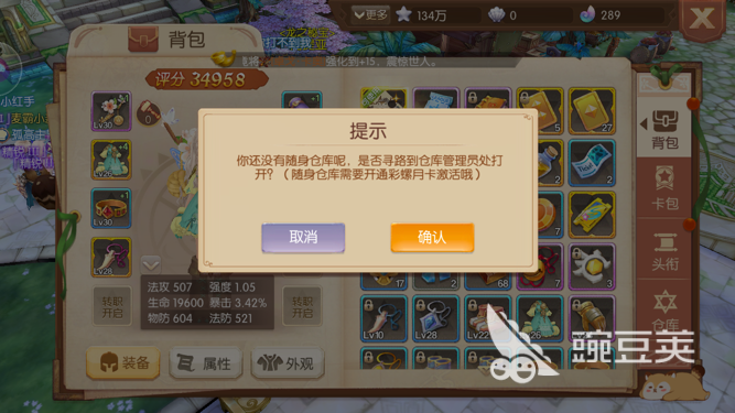 玩家点击跳出来的提升下方的确认,系统就会自动的带我们去找仓库的管理员了。但是想要成功的打开随身仓库,并不是去找到仓库的管理员就能直接的打开了,玩家还得开启彩螺月卡才能成功的解锁随身仓库。