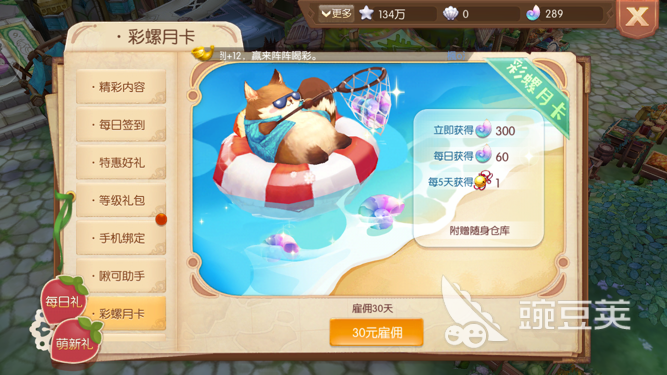 我们也在其中就能找到彩螺月卡的入口,点击彩螺月卡,就能花30人民币开启彩螺月卡了,开启彩螺月卡不仅会马上获得300个彩螺,而且接下来的30天每天都可以获得60个彩螺,每隔五天就能获得一个铃铛。成功的开通了之后就会赠送玩家随身仓库了。