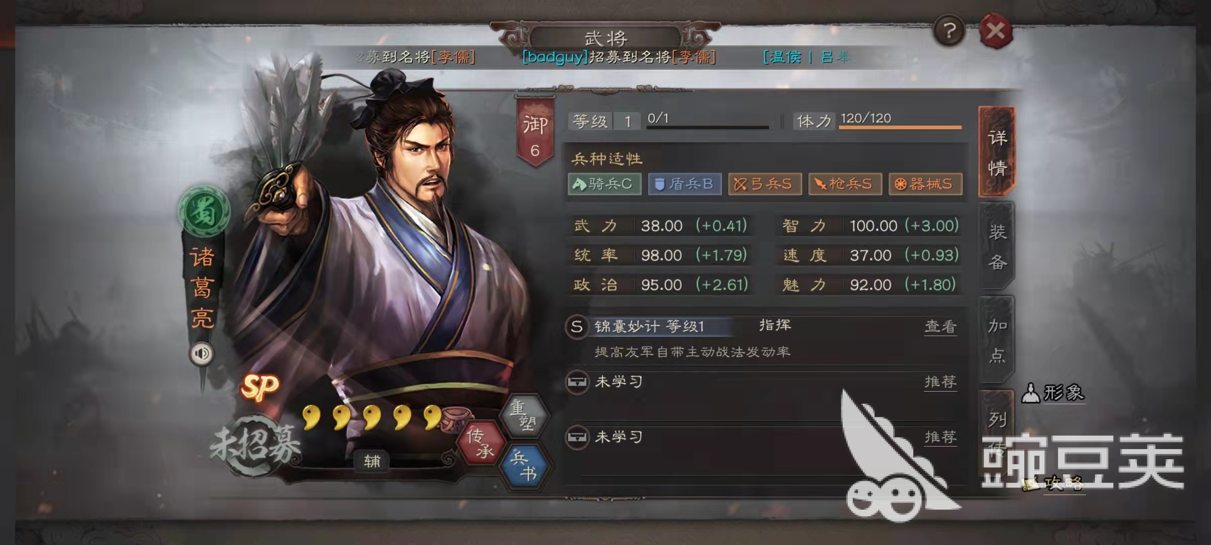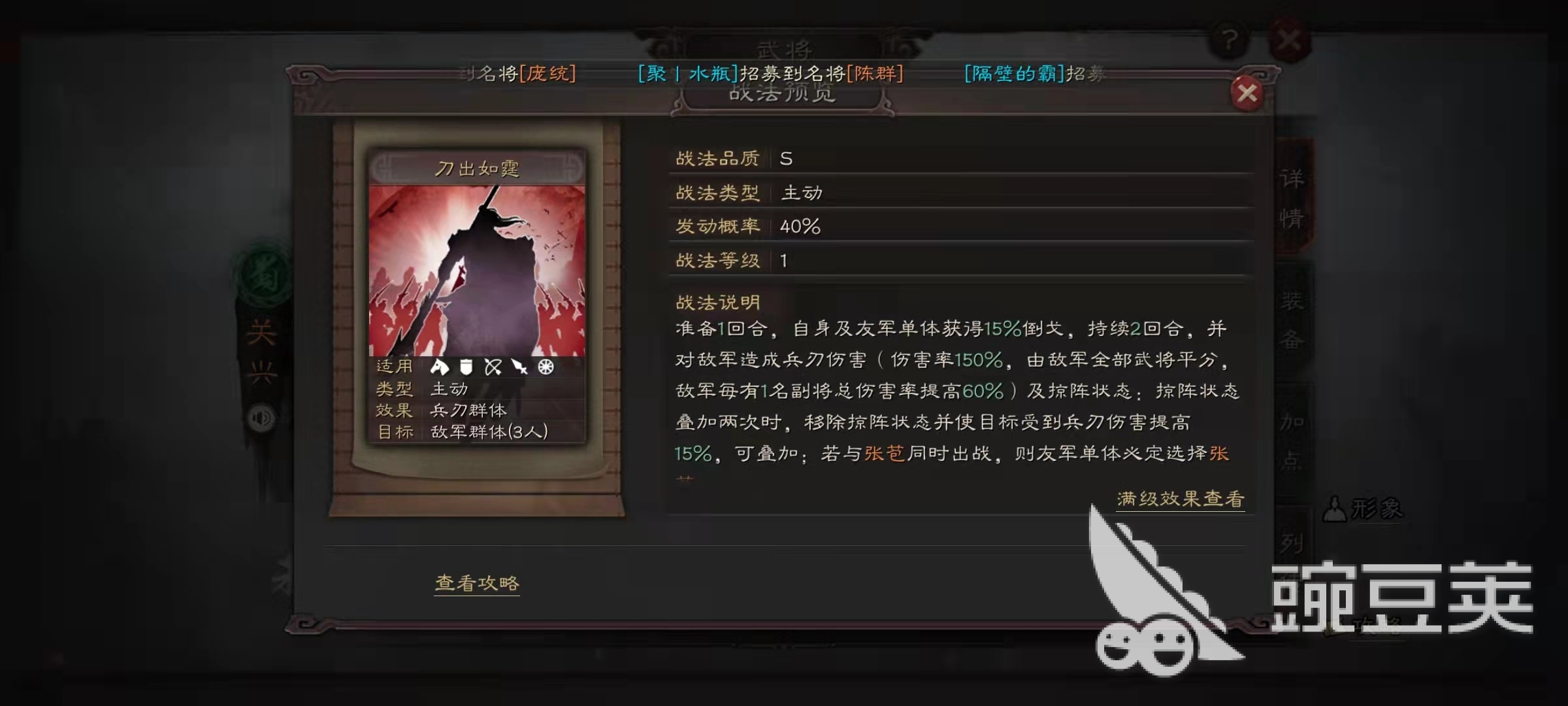 在其余的战法方面,关兴选择的是文武双全和所向披靡,其中文武双全的效果是造成兵刃伤害的时候可以提升一次武力值,最多叠加五次。关兴的武力值还不算是太高,所以这个技能可以更好的弥补一下。所向披靡的效果是对敌方全体发动一次兵刃攻击,在SP诸葛亮战法的加成下,可以更加频繁的发动造成群体伤害。SP诸葛亮的战法选择刮骨疗毒和杯蛇鬼车,其中刮骨疗毒的效果是可以为己方武将净化不良状态,并且恢复兵力,杯蛇鬼车的效果是可以对敌方群体造成谋略伤害。