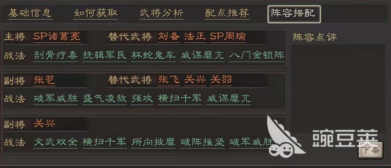 所以关兴的搭配就是张苞一起作为副将,主将建议选择SP诸葛亮,SP诸葛亮的自带战法锦囊妙计可以在战斗中发动,提升我方武将主动技能的发动几率。关兴和张苞都是主动战法型的武将,在SP诸葛亮的加持下能够更加频繁的放出技能。当SP诸葛亮为主将的时候,这个技能哈可以额外的对敌方的主将造成一次谋略伤害。