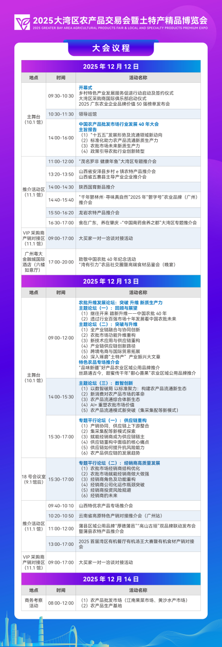 聚焦农业B2B交易的国际化展会——大湾区农产品交易会暨土特产精品博览会(简称“大湾区农交会”),定于2025年12月12日-12月14日在广州广交会展馆B区盛大举行。始出本届展会以“推动农品融湾出海助力乡村全面振兴”为主题,展览面积20000平方米,集结2000余款地方农特产,吸引超5000家全球采购商和超20000名国内外专业人士到会开展精准交易与深度交流,全力打造农产品领域的“广交会”级行业标杆盛会。